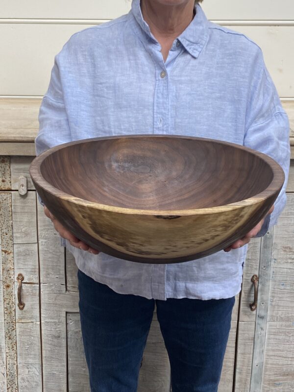 This extra large wooden bowl measures 18 inches across and brings serious presence to the table. It’s made from black walnut—dark, elegant, and naturally varied in tone.