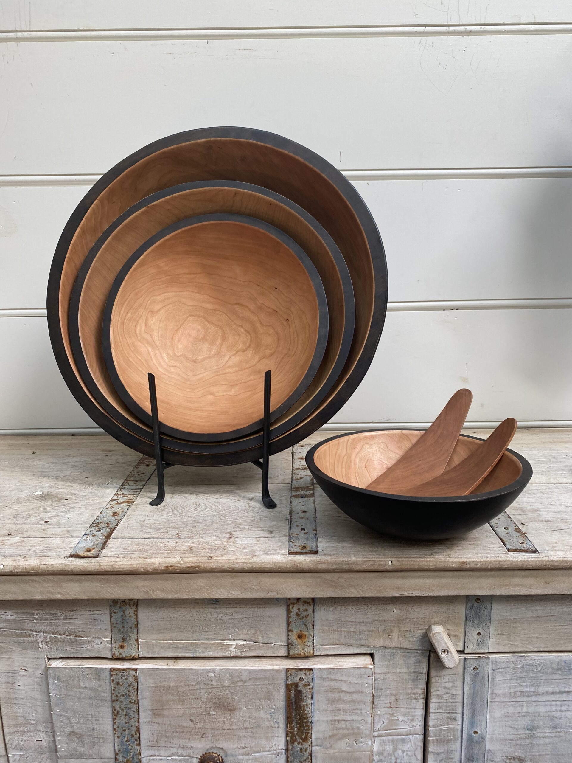We salvage cherry logs from New England, then turn and finish each wooden bowl by hand. The outside takes a food-safe ebonizing treatment; the inside is oiled so the grain stays visible and smooth to the touch. Some pieces show quiet, straight lines; others have a swirl that catches the eye mid-meal.
