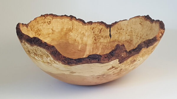 This 14-inch large live edge cherry burl wood bowl has enough space for a big family-style salad or a spread of fresh bread. The edge follows the uneven line of the burl, making the outline less like a perfect circle and more like the tree that grew it.