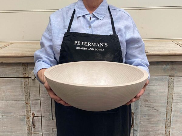 A 15-inch large white oak bowl with pale white pearl finish—perfect for serving or display.