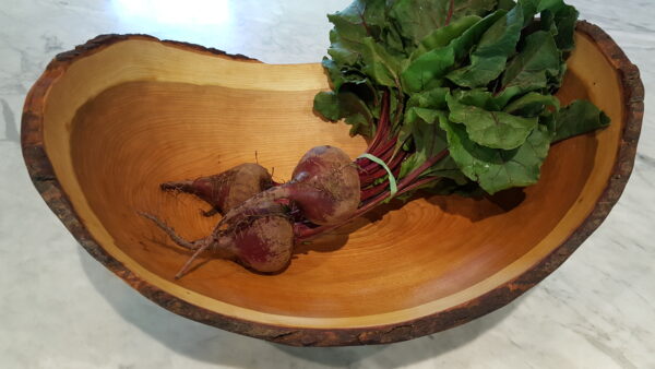 This 18-inch live edge cherry wood bowl is for when the table’s full and the meal is meant to be shared. It holds a heap of greens, a mountain of pasta, or a bright spread of fruit that guests can help themselves to. Its size makes it a natural centerpiece for a long table.
