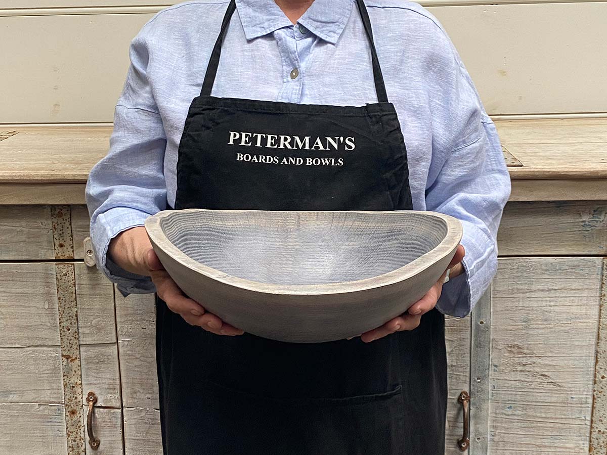 Live edge driftwood wooden bowl, 13 inches, turned from oak and finished with a light gray wash that highlights the grain. This finish is food-safe and keeps the wood’s character front and center.