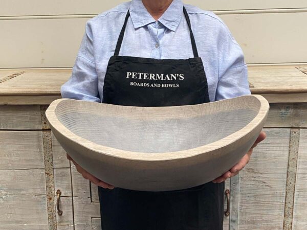 Live edge driftwood wooden bowl, 18 inches across, crafted from oak with a soft gray wash that brings out the texture of the grain. The finish is food-safe, smooth to the touch, and easy to maintain.
